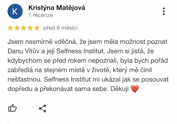 Svůj příběh jsem vložila do dvou knih a začala natáčet první online programy. Založila jsem si "svou školu". Vznikl projekt SELFNESS INSTITUT, kde předávám své znalosti, zkušenosti a dovednosti budoucím SELFNESS LEADERŮM. I vy se jím můžete stát - pro sebe nebo pro podporu druhých.